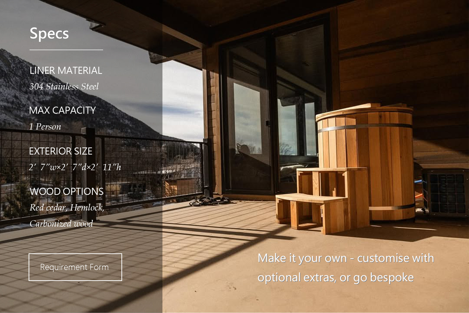 Discover the ultimate in customizable cold therapy with our unstained wooden tub. Make it truly yours by tailoring its look to match your deck, home, or Redwood Outdoors sauna—creating a seamless, personalized addition to your wellness routine.